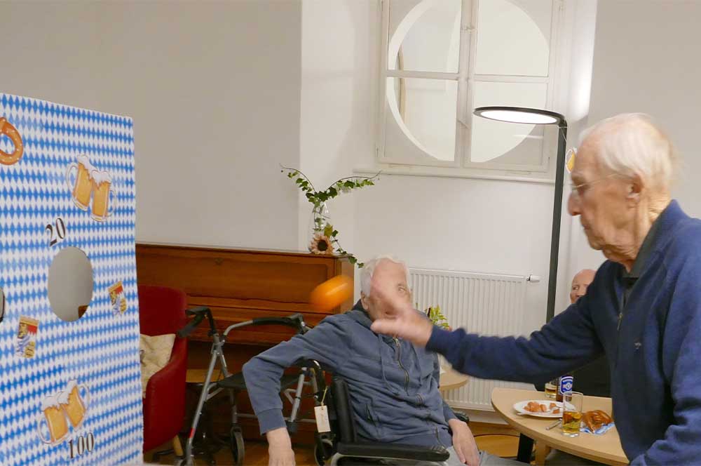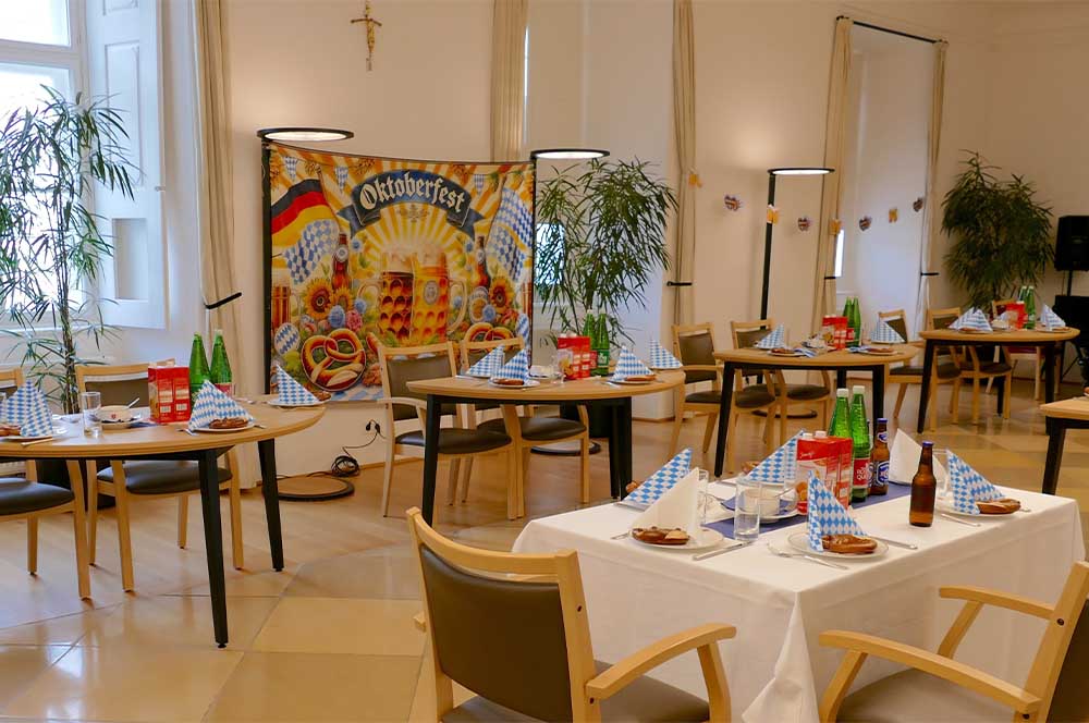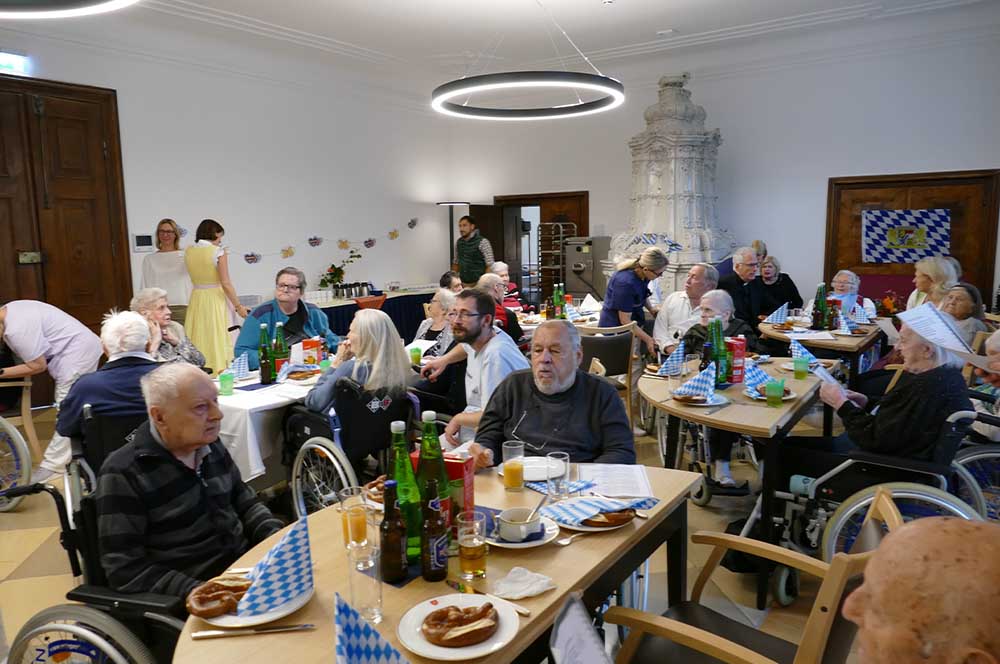 Am 9. Oktober 2025 hieß es im Malteser Ordenshaus, dem Pflegewohnhaus des Malteserordens, wieder: „O’zapft is!“ Das Refektorium verwandelte sich in einen liebevoll geschmückten Festsaal im bayrischen Stil. Der Duft von frischen Brezen und guter Stimmung lag in der Luft. Zu Beginn des Nachmittags sorgten bekannte Lieder für fröhliche Stimmung – natürlich durften Wies’n-Klassiker wie „Rote Lippen soll man küssen“ dabei nicht fehlen. Bald wurde mitgesungen, geklatscht und herzlich gelacht. Unsere Bewohnerinnen und Bewohner genossen das fröhliche Miteinander, die Gespräche und die Fest-Atmosphäre. Ein besonderes Highlight war die Wurfwand, bei der jeder vier Versuche hatte, möglichst viele Punkte zu erringen. Mit viel Begeisterung wurde gezielt, gelacht und angefeuert – und natürlich gab es für erfolgreiche Würfe auch kleine süße Gewinne. Die liebevoll gestaltete Fotowand, an der viele wunderschöne Erinnerungsfotos entstanden, helfen dabei, sich an dieseen Nachmittag noch lange zu erinnern, denn so bleibt dieser Tag nicht nur im Herzen, sondern auch auf Bildern lebendig. Ein besonders herzliches „Dankeschön“ geht an alle, die mitgeholfen haben, das Oktoberfest zu gestalten und dadurch für so viel Freude und gemeinsames Lachen bei unseren Bewohnerinnen und Bewohnern gesorgt haben!