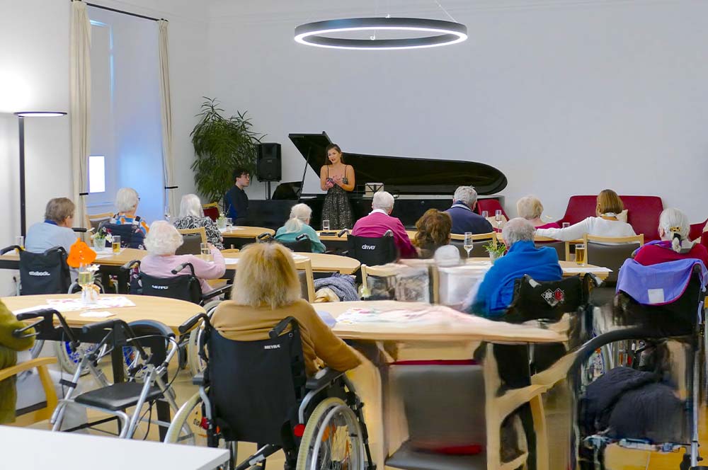 Am 16. Oktober 2025 war es wieder soweit: Durch die großartige Kooperation mit Live Music Now ist es möglich, jedes Monat ein Konzert für die Bewohnerinnen und Bewohner des Pflegewohnhauses des Malteserordens zu bieten. Bis zur letzten Minute herrschte gespannte Vorfreude im Auditorium: Wird diesmal gesungen, Klavier gespielt oder hören wir vielleicht eine Geige? Um 16.00 Uhr war es soweit – die junge Musikerin Darinela Vangelova (Sopran) und Akihiro Sano (Klavier) betraten das stilvolle Refektorium des Malteser Ordenshauses. Die beiden verzauberten das Publikum – mit einer wunderschönen Stimme, und dem mit großer Sensibilität zum Klingen gebrachten Konzertflügel. Das Programm spannte den Bogen von bekannten Liedern der Wiener Klassik, wie der „Forelle“ von Franz Schubert, über Claude Debussy und Giacomo Puccini, bis hin zu bekannten Operettenschlagern von Franz Lehar. Der Raum wurde so mit einer ganz besonderen Atmosphäre erfüllt und die Musik berührte viele Herzen, was in den Gesichtern unserer Bewohnerinnen und Bewohner deutlich zu sehen war. Ein herzliches Dankeschön gilt Frau Suchy-Eissing von Live Music Now für die Organisation sowie Darinela Vangelova und Akihiro Sano für die großartige musikalische Darbietung. Danke für einen wunderbaren Nachmittag, der noch lange in schöner Erinnerung bleiben wird.